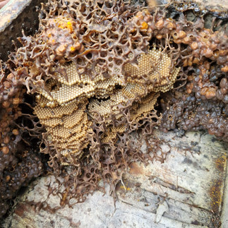 Ce sont des abeilles très agressives entre elles et qui se livrent régulièrement au pillage. La manière dont elles construisent leur nid est une œuvre d’art. Au centre se trouve le couvain autour le Pollen et le Miel. Le couvain se trouve enfermé dans une sorte de propolis mélange à de la cire d’abeille. L’ensemble ressemble à une forme de papier mâché. Le Miel quant à lui est conservé dans des sortes de billes ou d’amphores. Cela me fait un peu penser à la forme de ces algues noires que l’on retrouve au bord de l’océan atlantique. Finalement ce qui différencie essentiellement la Tetragonoula Srikanthanathi de la Lepido Trigona c’est une construction du couvain par étage alors que la construction de la Lepido Trigona se fait en cercle.