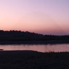 Le ciel prend une belle teinte orangée. J’en profites pour suivre le cours de la rivière. Mes pas m’amènent au sein d’un restaurant de plage. Ambiance tamisée, chant des oiseaux et des cigales locales, table en bord de berge avec bougie, berge et rive à peine à quelques mètres et le serveur en tenue de lodge. Je me croirais presque dans un décor de film des années 60. Je laisse les tables s’effacer pour rejoindre le bord de berge jusqu’à ce que mes pas m’emmènent face à une masse uniforme présente dans l’eau. Plusieurs touristes sont présents. Surprise, je ne m’attendais à rien et voilà que je me trouve face à un rhinocéros. Ce gros pépère semble ne pas trop vouloir bouger. On ne perçoit que ses grandes oreilles et de temps en temps ses narines. Sa patience de boudha et de pacha a raison des touristes. Ceux-ci s’en vont, il ne reste plus que lui et moi. Et là tout d’un coup c’est le bal des lumières ; le ciel dont la teinte était passée à l’orange pâle se drape de nouvelles couleurs de rose ; platine, marbre, fuschia, le tout rien que pour moi. Et au milieu de la rivière, rien que pour mes yeux, le rhinocéros daigne enfin se lever et se montrer sous sa plus belle robe.