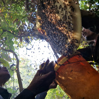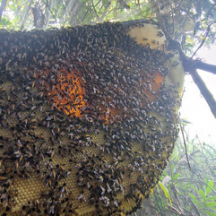 Nous avons donc pu bénéficier de dix minutes pour à la fois observer le nid et voir les rafters prélever le miel. Ils sont très impressionnants. Ils fonctionnent sans gants ni protections. Ils interviennent en sandales, à manches courtes. A chaque fois que je vois des apiculteurs agir ainsi je suis subjugué. Au moindre choc, écart, ou dépassement de temps, les abeilles peuvent se retourner et attaquer les personnes proches du nid. Les conséquences peuvent être mortelles. Les rafters que nous avons rencontrés ont été formés à une apiculture durable ; ils ne prélèvent dès lors que la partie supérieure gauche ou droite du nid correspondant à la zone de stockage de miel.
