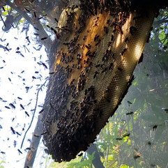 Ça n’est pas un sentiment de peur qui m’a envahi quand nous nous sommes approchés du nid mais plutôt un sentiment de gratitude. Avoir la chance de pouvoir contempler un nid d’abeilles sauvages d’aussi prêt (quelques centimètres) est quelque chose d’assez exceptionnel. Être si proche du nid permet de se rendre compte de toute la vie qui l’entoure, de ressentir son énergie, de voir tout cet univers en action ce qui est fantastique.